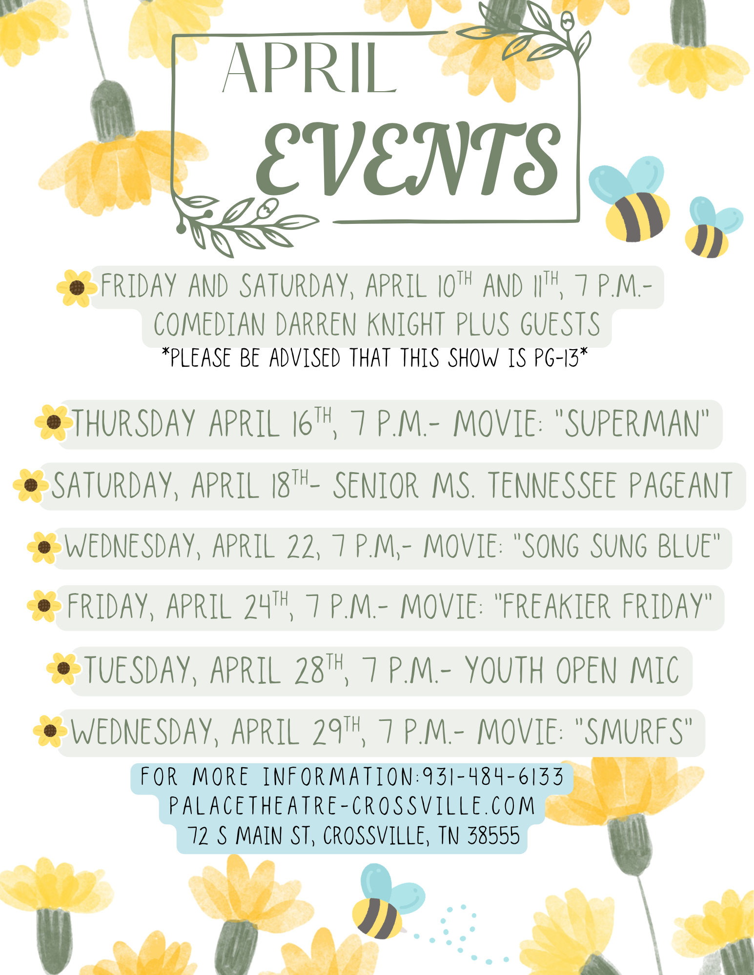 The Palace does hold regular functions, but our schedule is quite flexible and we will do everything in our power to accommodate your and your needs. And remember, we do not just serve Crossville, we serve Cumberland County, the Cumberland Plateau and the whole of the East Tennessee area. The Palace Theatre can entertain yoou AND support your business or municipality.